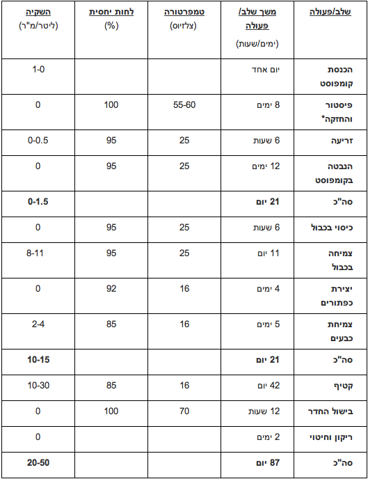 לסיכום מפרטת הטבלה את שלבי הגידול, בחדר מייצג עם שטח גידול של 150 מ"ר.